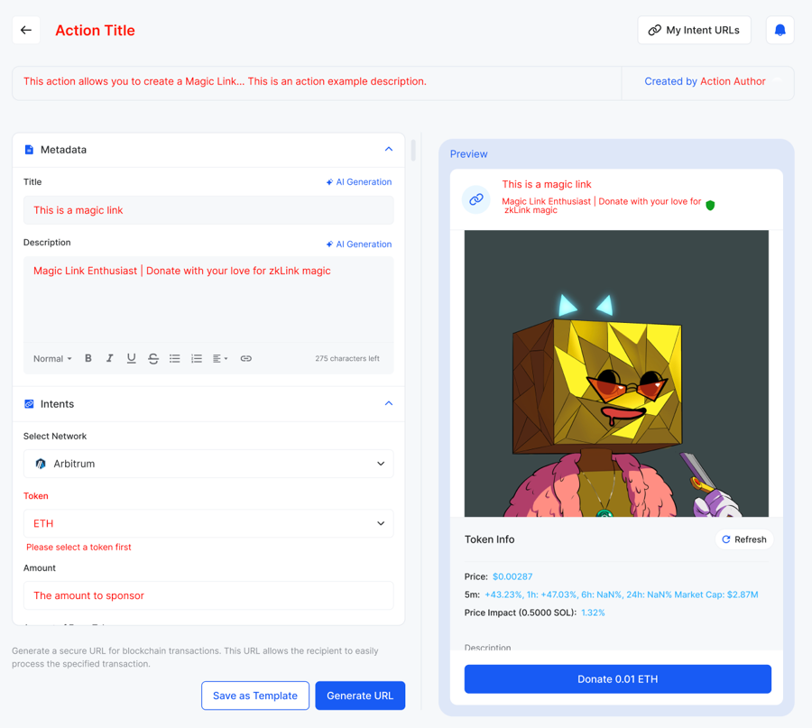 Simplified Transactions: Wrap complex on-chain operations into a simple link. Users click the link, enter parameters, confirm, and initiate a transaction.
